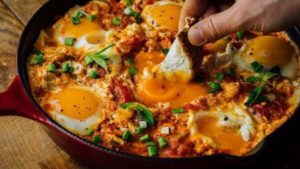 Chakchouka (also called shakshouka) is a Tunisian and Israeli dish of tomatoes, onions, pepper, spices,